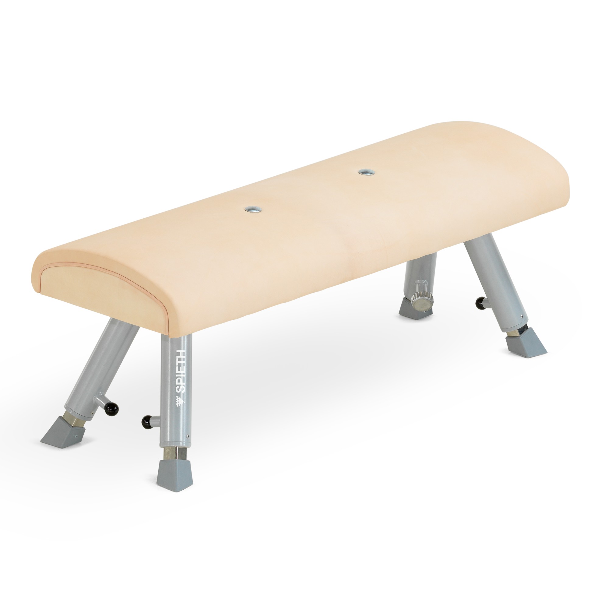 The training device to facilitate the transition from mushroom to pommel horse and to teach double leg circles being the significant part of contemporary performance on pommel horse. The width of 45 cm (instead of 35 cm) makes holding on the body easier. 4 feet can be easily height-adjusted from 50 to 65 cm in 3 steps. Excluding pommels and pads.