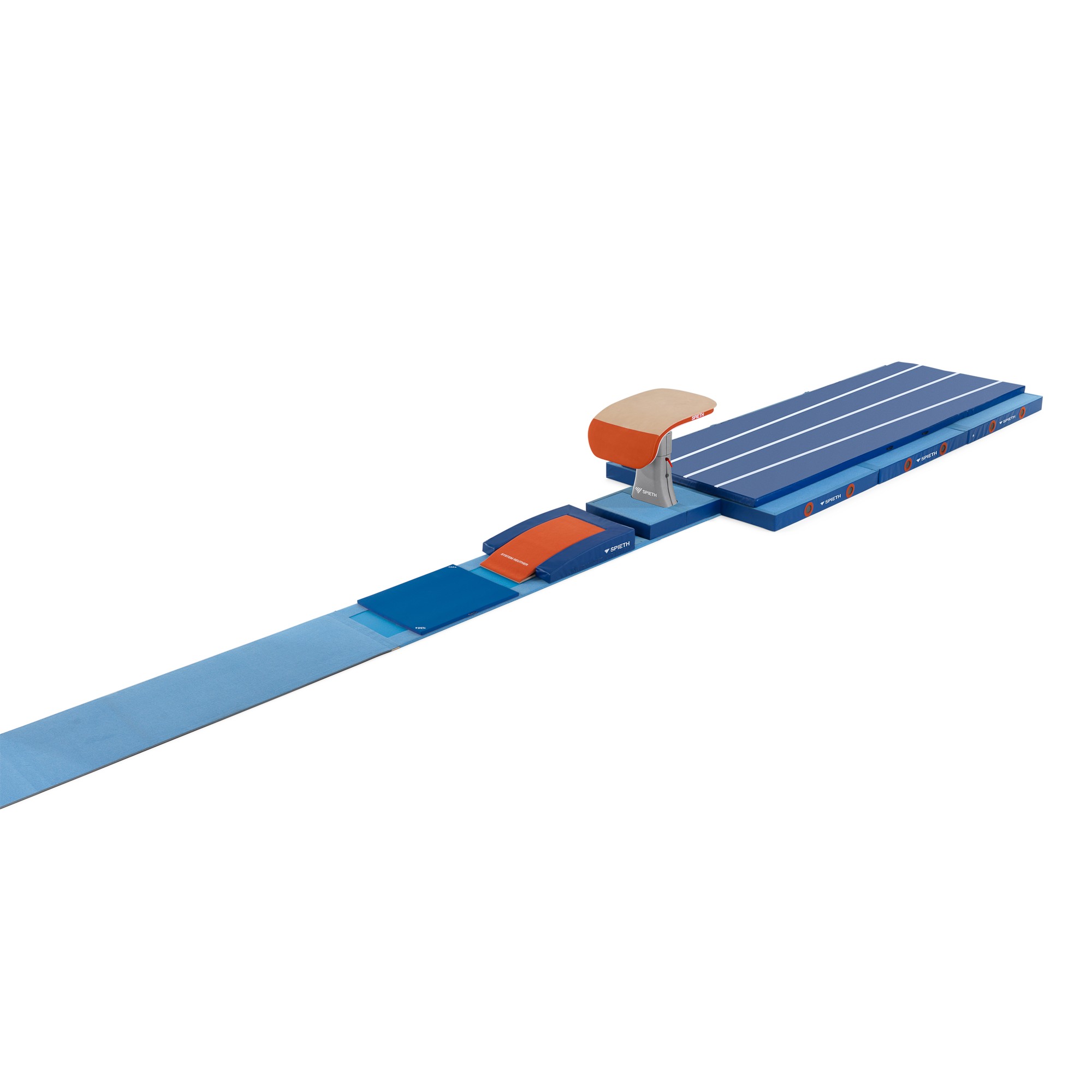 ORIGINAL REUTHER consisting of: 1 special run-up (width 100 cm, 25 mm height, 23,10m length) made of special foam material, topped with longwearing soft velour “Triflex”,with 1 jumping device for springboard (244 cm long) and 1 for vaulting table (199 cm long) incl. floor space with through-hole for tension chain. Incl. 1 measuring tape and roll-up core. Total length 25 m. Colour spieth-blue.