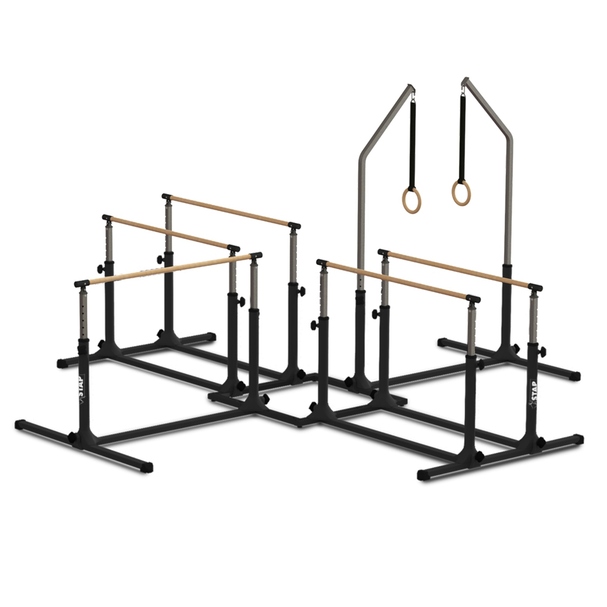 Square-shaped, space-optimized base frame incl. “Happy Gym” Uneven Bars, Horizontal Bar, Parallel Bars and Rings.